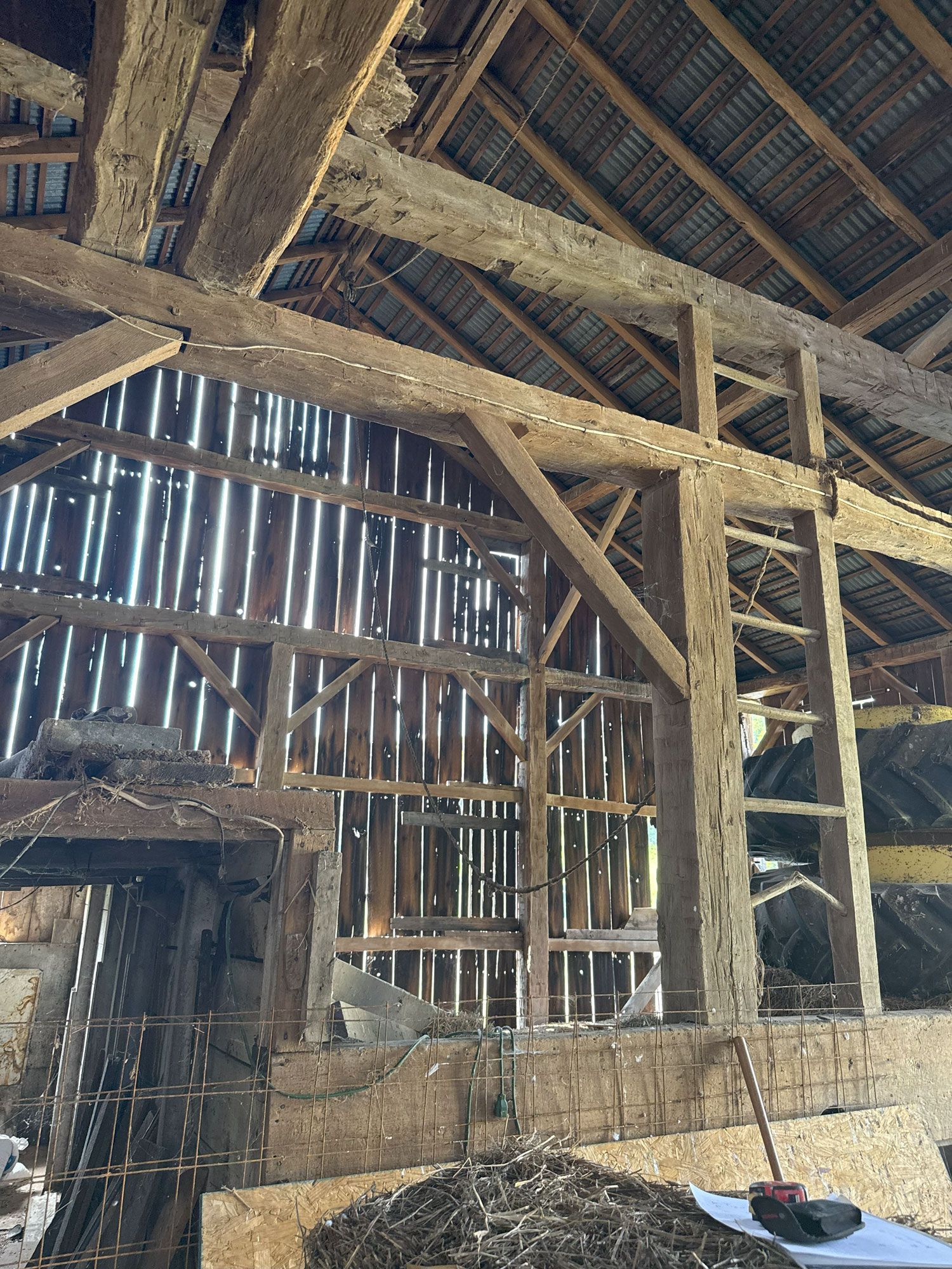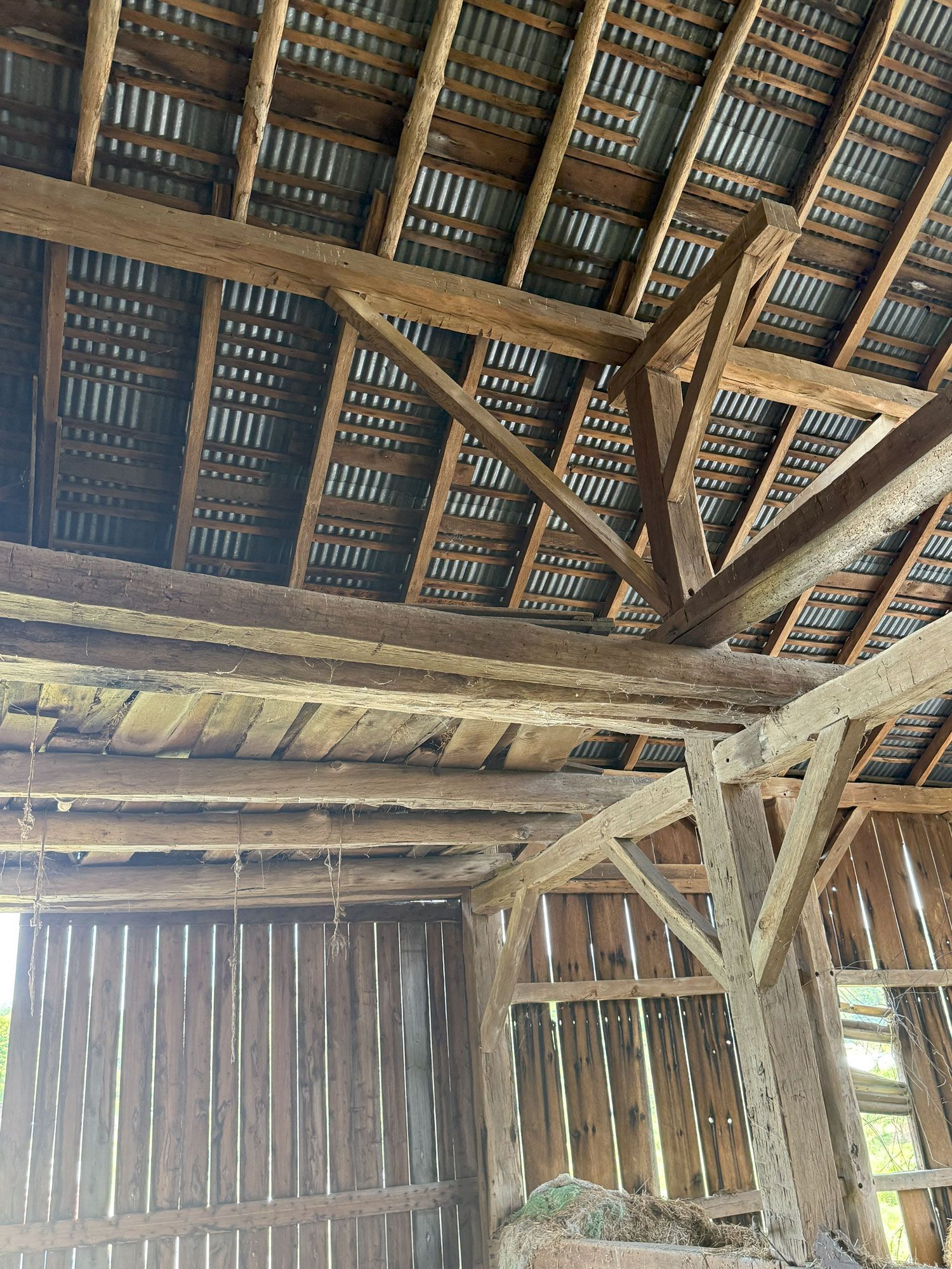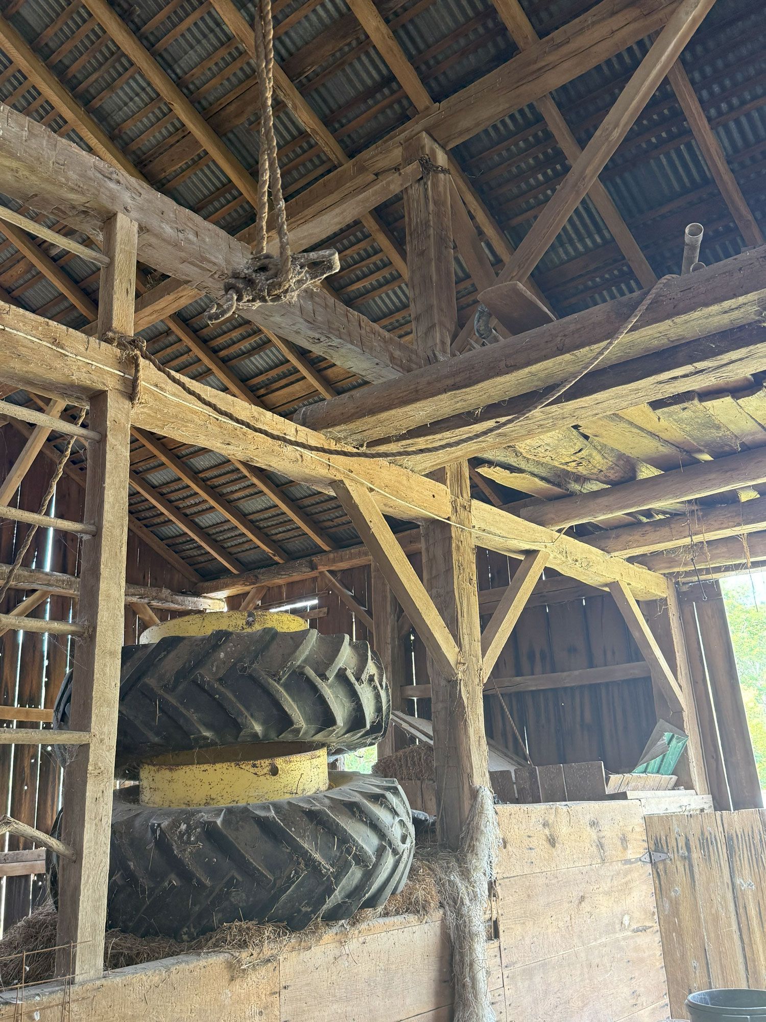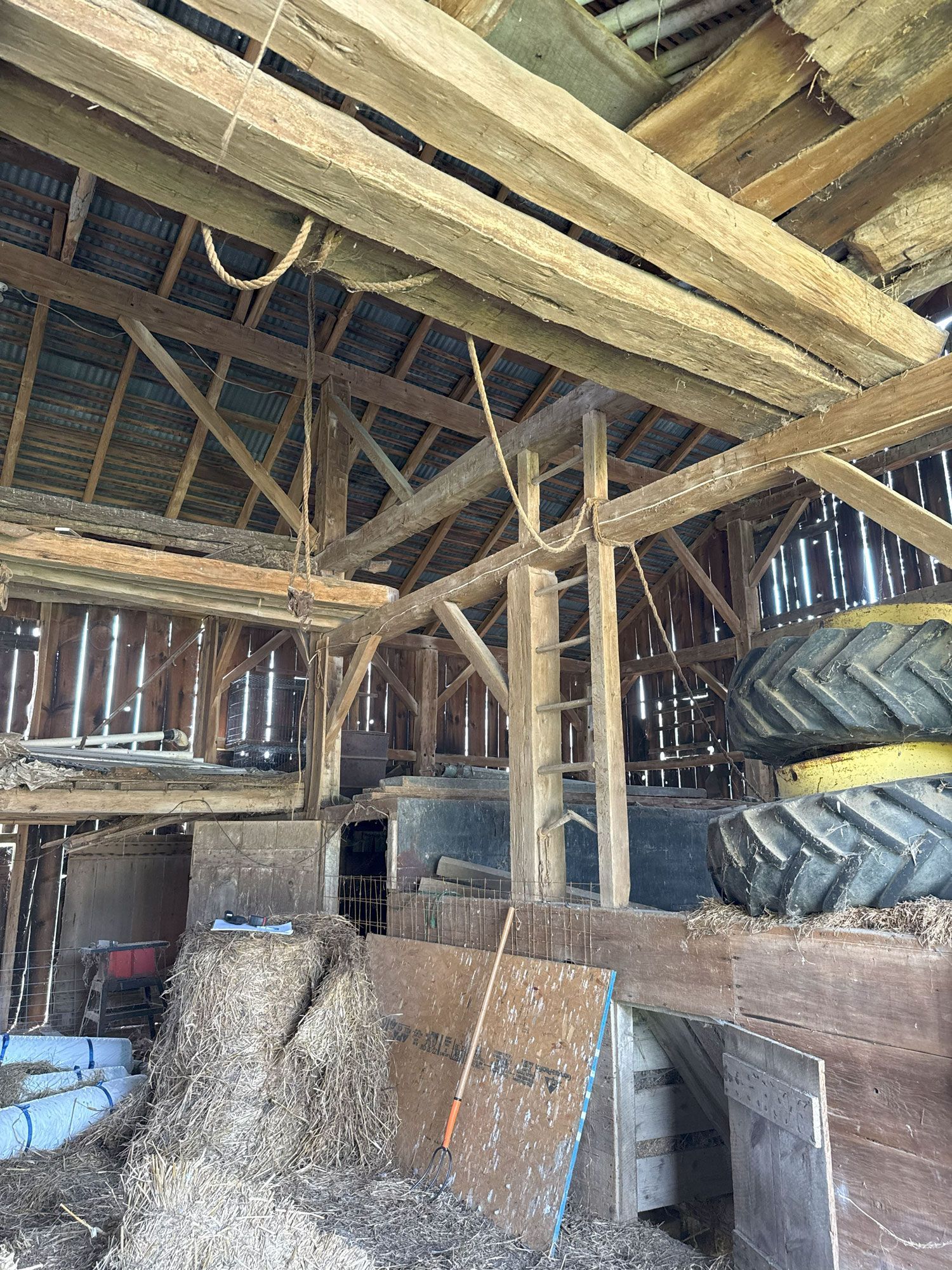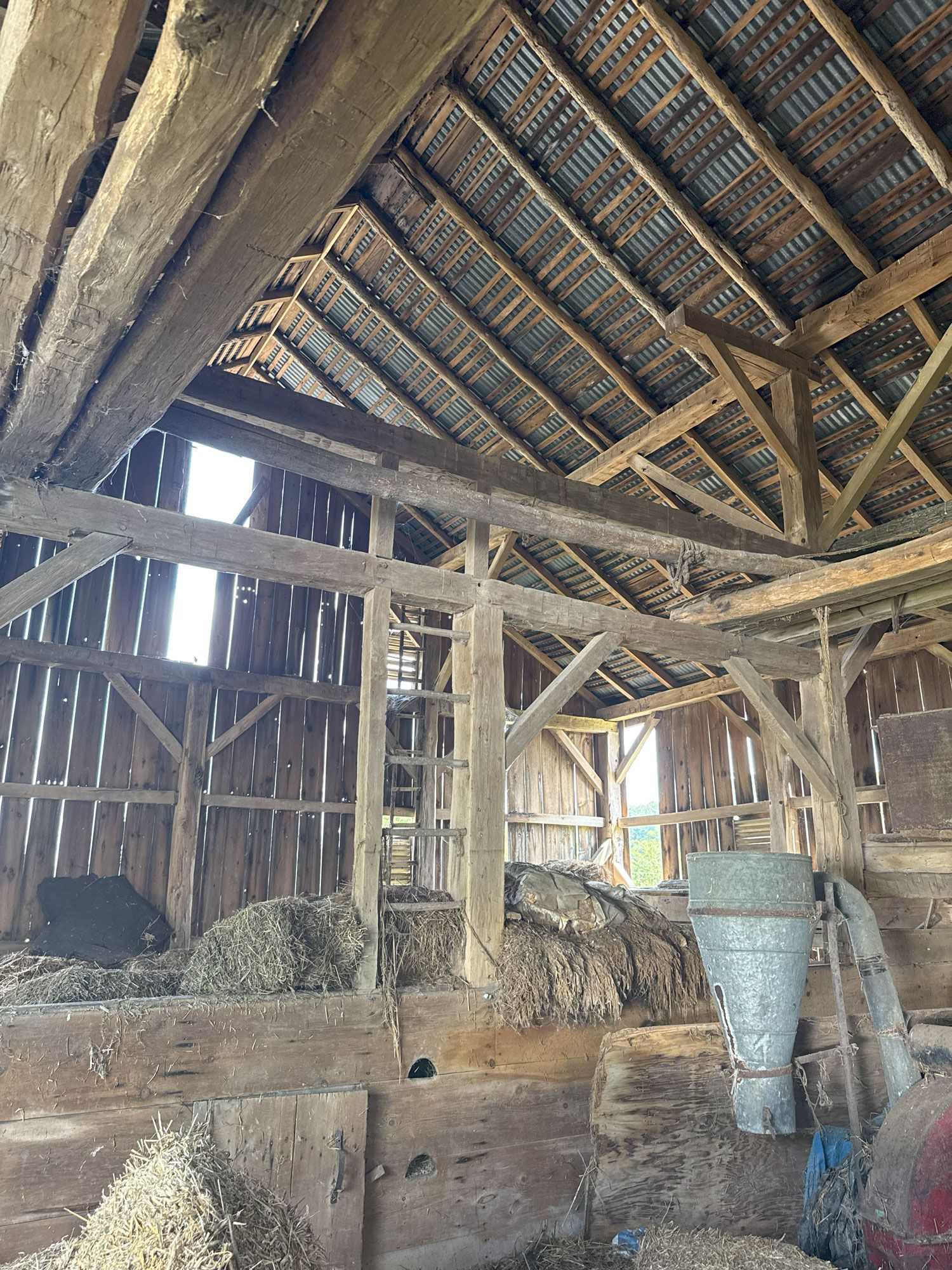 Holy cow what a beautiful barn frame. This frame has all the traditional look and feel a person could want. It is also beautifully engineered for any heavy snow load if a northern location is in the mix. Double ties accent the frame system and make for great second floor or loft opportunities. Still a working barn, it will be cleaned out and dismantled late 2025.